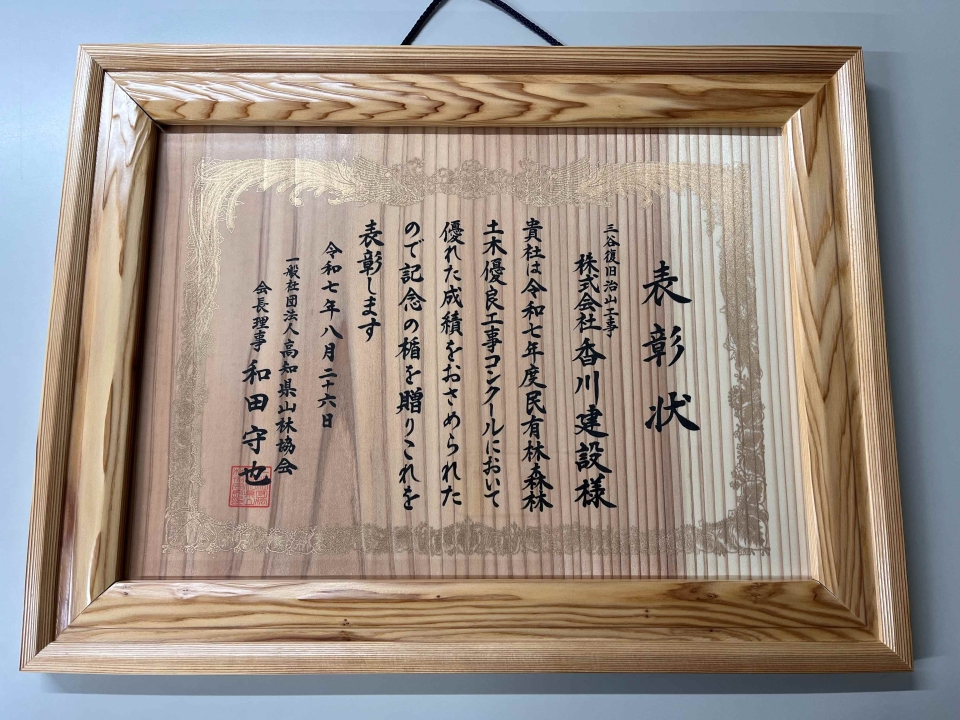 表彰状を頂きました 令和7年度民有森林土木優良工事コンクールにおいて、表彰状を頂きました。第三者機関より評価をいただけたことは、当社にとって大きな励みとなっております。これからも地域に根差した企業として、誠実な施工を積み重ねてまいります。